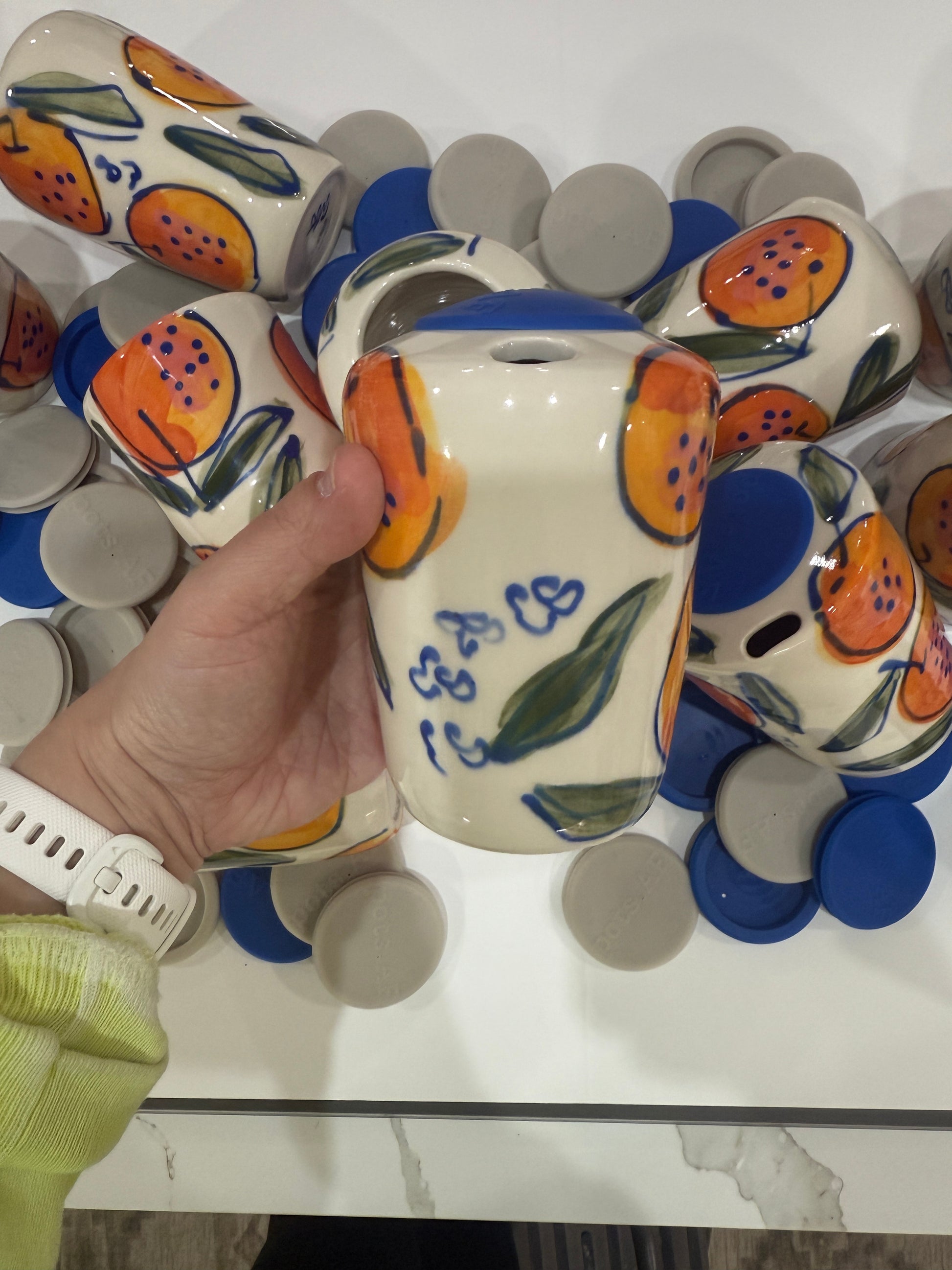 The ultimate ceramic travel tumbler! Designed with a custom food grade silicone stopper to prevent liquids from sloshing in the car, your mouth never has to actually touch the silicone, making it the best of both worlds! (your cup comes with two silicone stoppers, though it can be used without a stopper, too!)