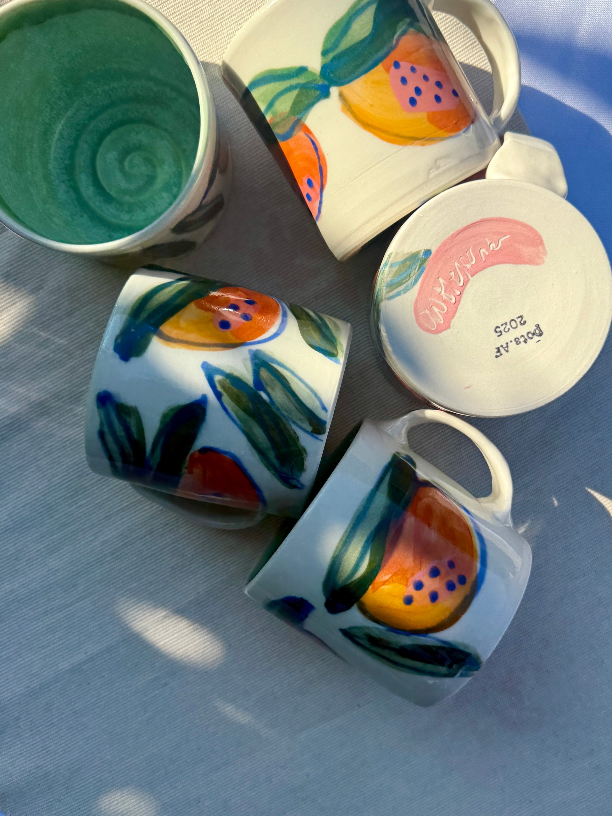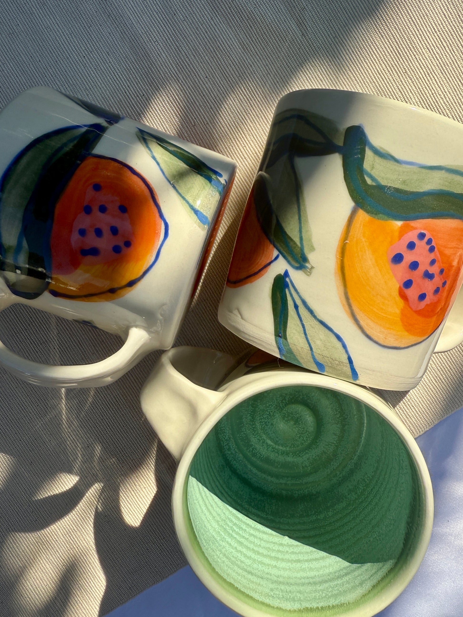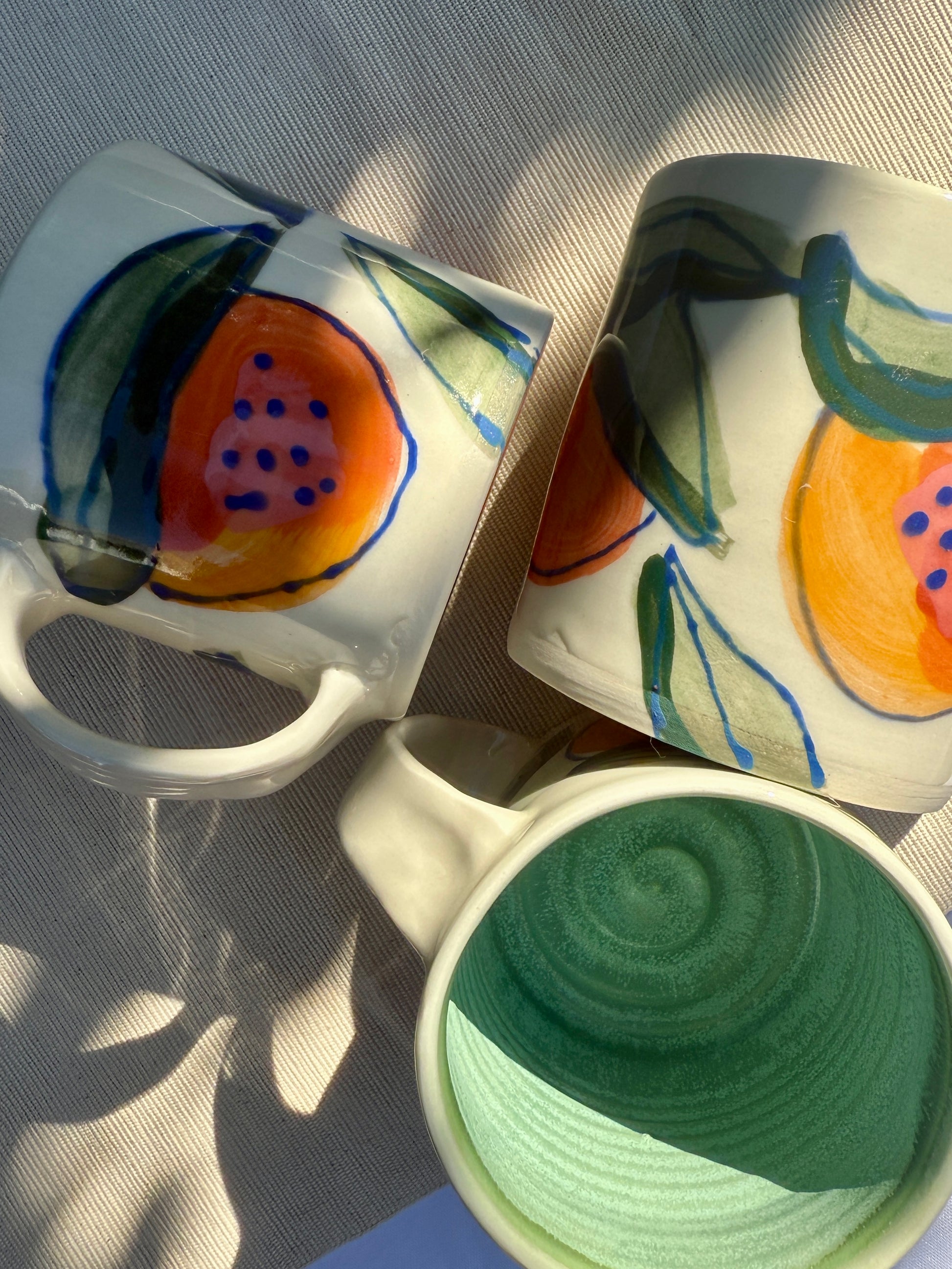 Comfortable full fingered hold, hand-thrown. Features a vibrant green interior, clear coated exterior.