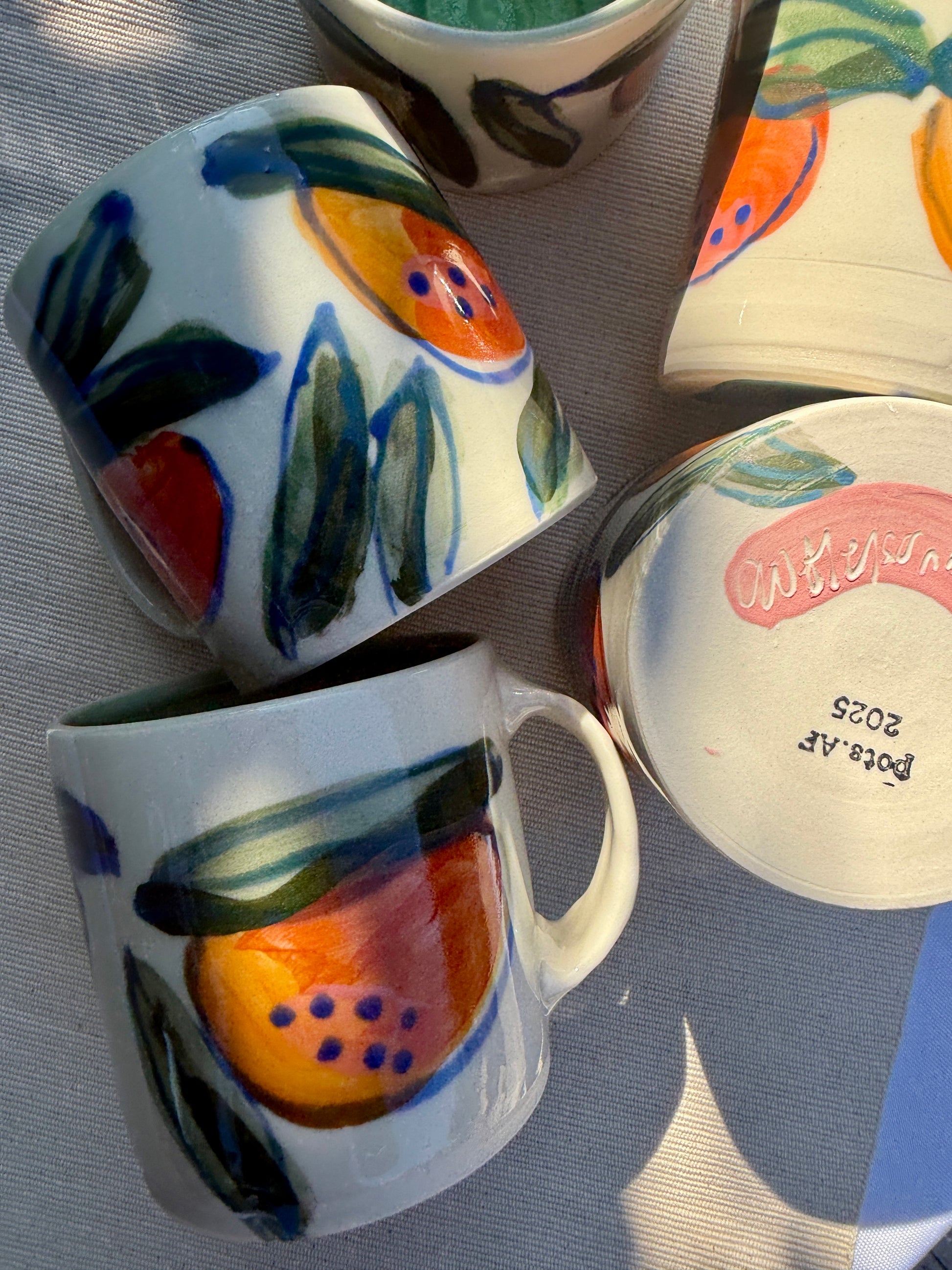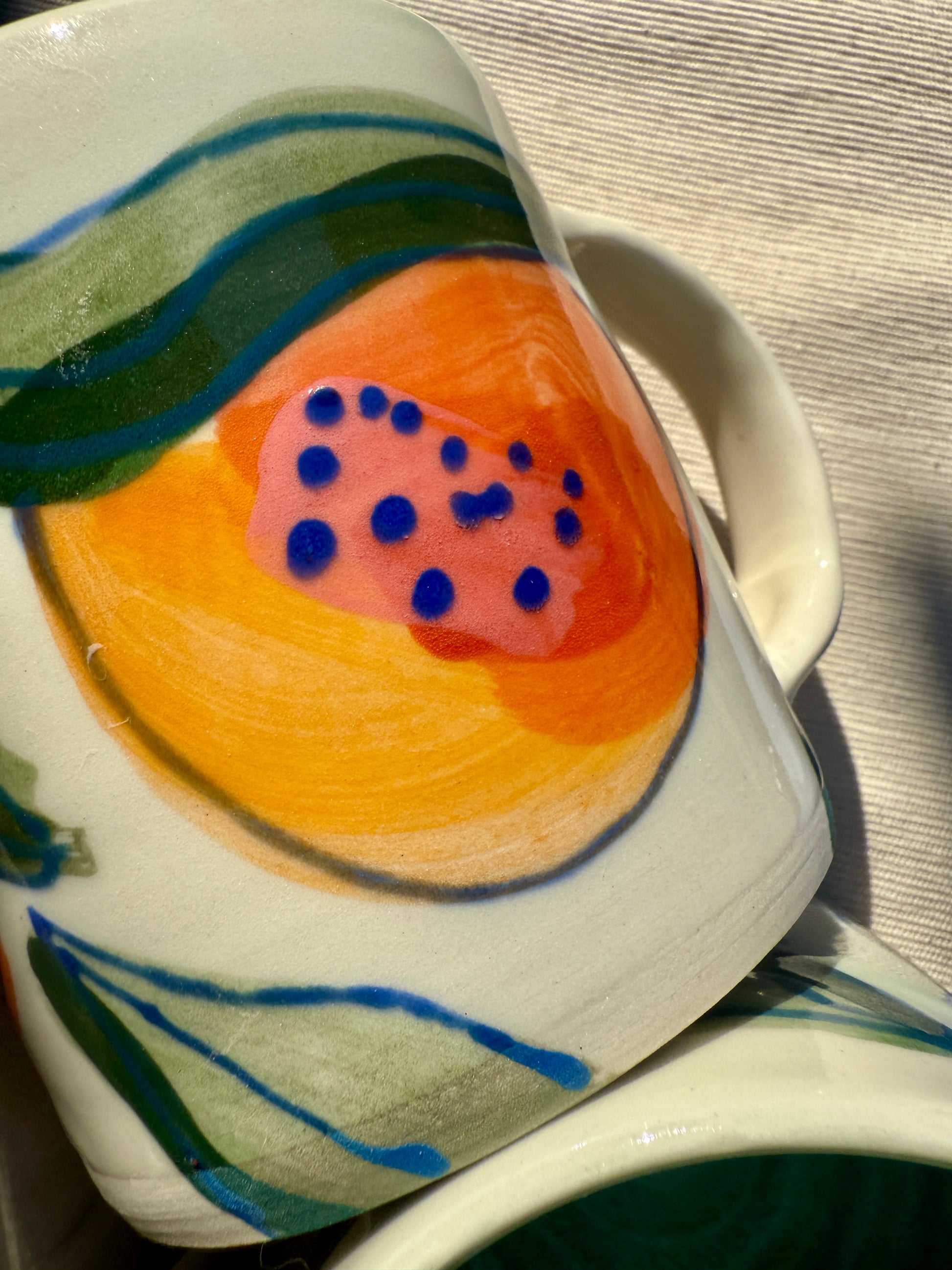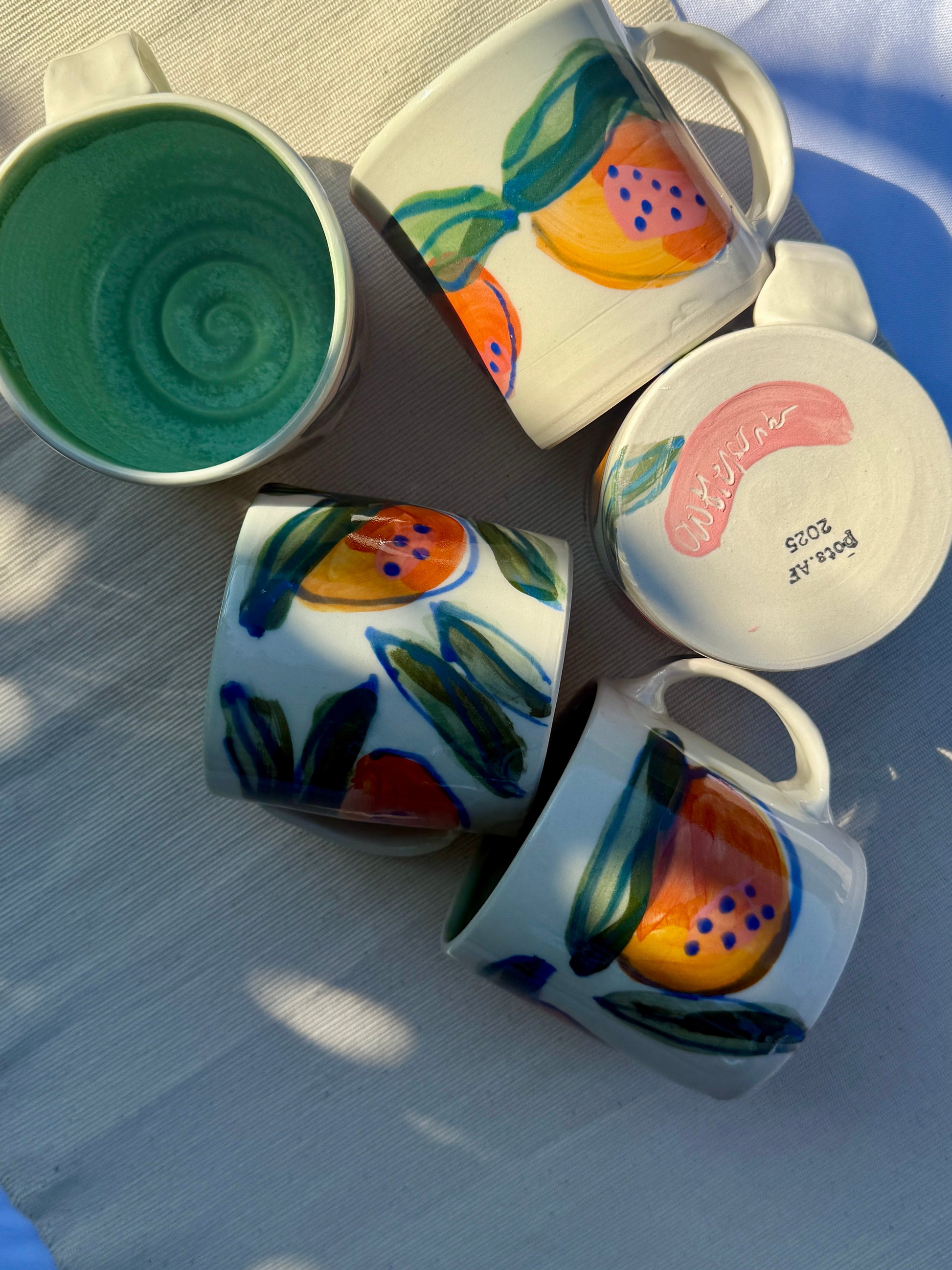 Comfortable full fingered hold, hand-thrown. Features a vibrant green interior, clear coated exterior.